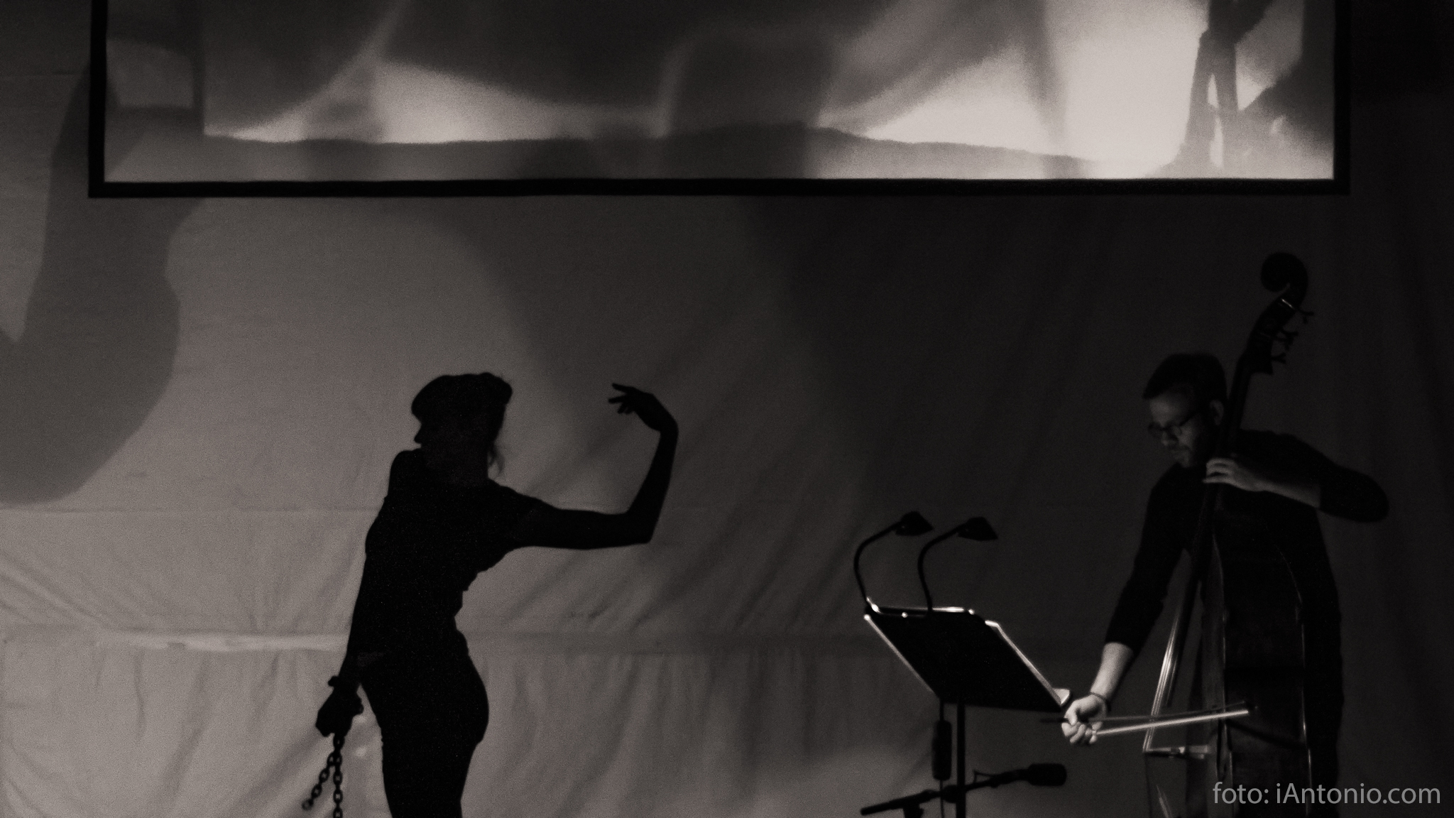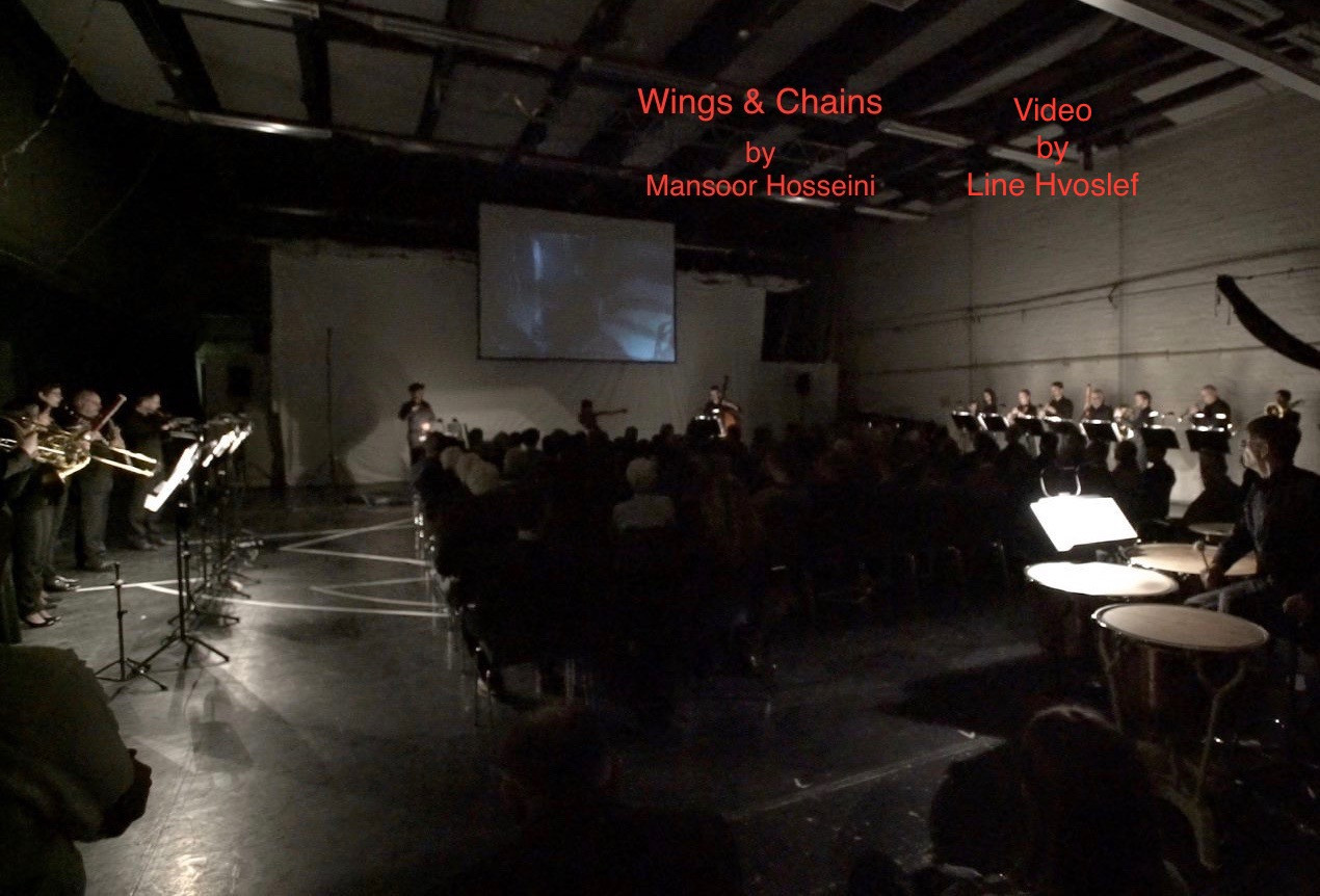 Wings and Chains «Wings and Chains» – a consert in Komische Oper, Berlin 2017 For camber orchestra, solo double bass, dancer and video. Music: Mansoor Hosseini, Solo double bass: Jesper Ulfstedt Conductor: Jordan de Sousa Video: Line S. Hvoslef